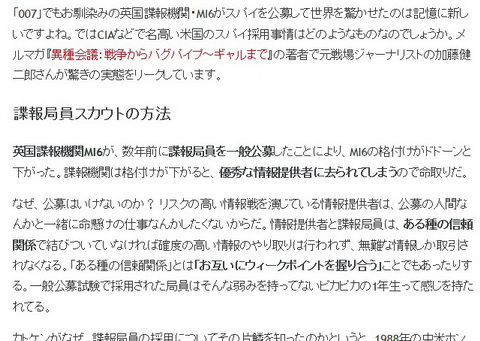 MAG2NEWS(まぐまぐニュース)が、 カトケン発行のメルマガ「異種会議」を 4度目の推薦。 諜報機関の採用は、優秀な人間を採ればよいというわけではない。 そういう能力主義みたいなことやると、スノーデンみたいのを 雇ってしまうことになるのかもしれないね。