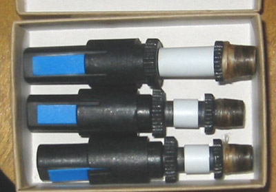 ドローンリードは、3本のドローンパイプに1つずつ挿し込むのだが、 ベースドローン(一番低い音)のドローンリードが一番長い。 写真は、シェパード社のSM90というドローンリードだが、 ドローンリードーにもいろいろなメーカー商品がある。 |
