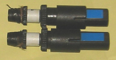 シェパードのドローンリード、青い部分がベロ。 写真のようにベロの長さは簡単に変えられる。 ベロの根元の黒いリングをスライドさせる。 ペロを長くすると音程は低くなる。 空気の抜ける量が多くなるので、演奏には吹き込みパワーがより必要になる。 また、長くすることによって、音量が大きくなるような気もするのだが、リード によっては音量は変わらないような気もした。 |