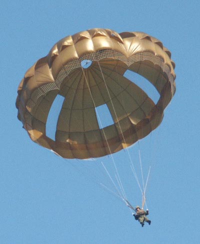 2000年から陸上自衛隊が導入した、フランス製の空挺傘696MI。 単なる丸形傘でないところが、おフランスちっく? |