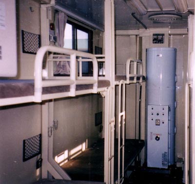 自活車の中。 写真はないが、ペトリオット部隊が装備している「待機車」も凄かった。自活車 よりも多数を載せるようになっていたが、冷房が効いているので、隊員たちは外 に出る気にならなかった。 |