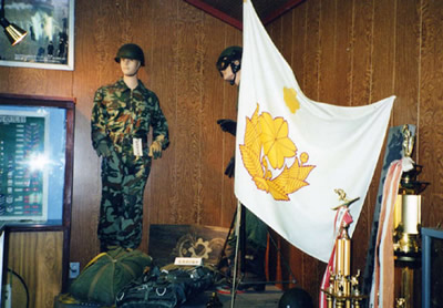 『第一戦車団旗』 かつて北恵庭駐屯地には第一戦車団があった、101,103,104,の戦車大隊を改編 し第一戦車群、第二戦車群、第三戦車群を第一戦車団とした。 現在第一戦車群以外は第七師団の機甲師団化に伴い戦車連隊に改編された。 こ の団旗を注目して頂きたい、陸上自衛隊のマークに桜が一つこれは将補が指揮官 となる団、混成団、旅団の隊旗である。 昭和末期から平成初頭まで戦車部隊は大きく変遷を遂げた、方面直轄の独立戦 車中隊が編成され316戦車中隊が第二戦車大隊(当時)317,318戦車中隊が真駒内 の第11戦車大隊に、そして319戦車中隊が鹿追の第5戦車大隊(当時)に、320戦 車中隊が第一戦車群に編成され増強された。 |