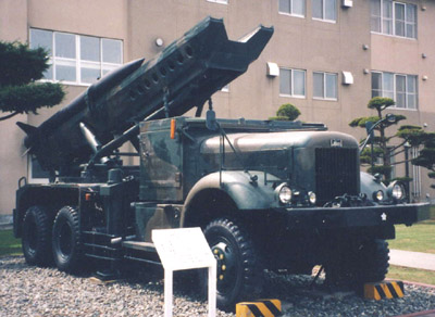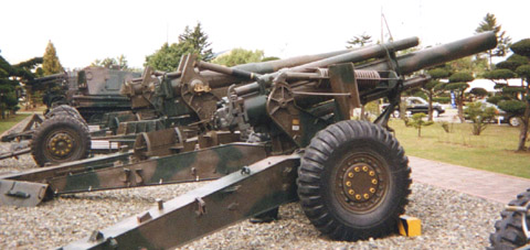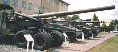 『30型ロケット?』 砲について説明したい所だが勉強不足でごめんなさい。 203ミリ榴弾砲が展示してあったので思い出を書くことにする。 中学生の頃上富良野駐屯地に見学に行った、ここには第一特科団隷下の4群があ り当時203ミリ榴弾砲が装備されていた、朝鮮戦争で米軍が使っていた大砲と の説明を受けた。 そんな古い大砲を使っても大丈夫なのか?と思ったのを覚えている。 大事に整備しながら愛着を持って演練してきたのだろう。 自衛隊に入隊して戦車部隊に配属になって驚いた、第二次世界大戦で使用され ていたグリースガン(11,4ミリ短機関銃)AタイプBタイプ両方あった、戦 時中米軍が缶詰工場で作った機関銃と聞かされ驚いたが故障も多かった、今でも 使用しているから驚きだ、中国の軍事博物館で朝鮮戦争の戦利品としてこの短機 関銃が展示してあった、骨董兵器の多いのも自衛隊の現実なのかも知れない。 火砲展示場を作るのに大変な苦労されたのでしょう、計画が作られ完成するの に4年もかかった、歴代駐屯地司令や関係者の御尽力により歴史と伝統を継承す る火砲展示場が整備完成したのは自衛隊にとっても良い見本だと思います、これ からもどうぞこの良き伝統を継承して下さい。 以下、火砲展示場に敬意を表して |