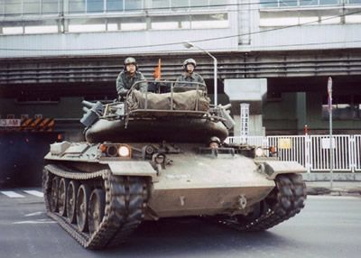 写真の戦車はライトを点灯しているが一般車輌への注意喚起だ。