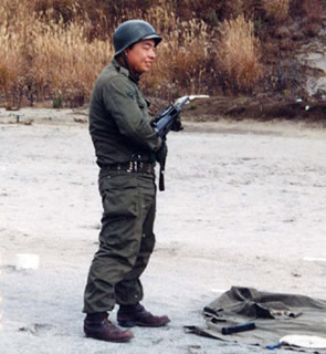 『座り撃ちでサブマシンガン射撃をする』 戦車乗員には個人携行火器がある、最近は装填手、操縦手、砲手は折り畳み式 の89式小銃が配備されているそうだが、私の居た頃は装填手が64式小銃で操縦手 と砲手がサブマシンガンであった。 このサブマシンガンをグリースガンとか呼ぶ人も居るが正式名称は11,7mm短機 関銃である。乗員は「サブ」とか「サブマシンガン」「短機関銃」と呼んでいた。 |