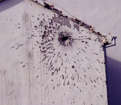 100ミリ戦車砲弾。 弾痕の周辺の焦げあとから、Heat弾(成形炸薬弾)と分析する専門家が多かっ た。 1992年11月上旬、クロアチア、ツェムニック。