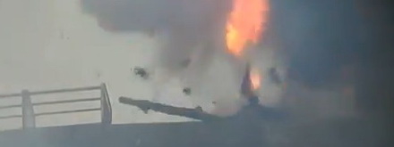 シリア政府軍のT−72戦車が直撃弾を受けて