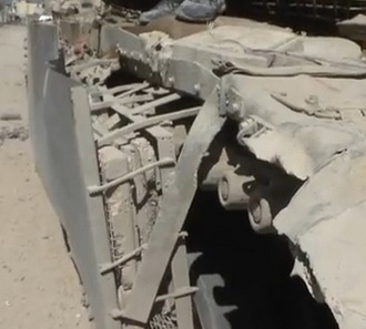 違車体側面をカバーするスカート装甲。 スカートについては、上から2枚目の写真がわかりやすいかな。 これは、側面の増加装甲ボックスが脱落しやすいという欠点を補うために生まれ たのだが、スカートと増加装甲ボックスの隙間にも、レンガや石っころなどが詰 め込まれている。 参考映像 (このページのシリア戦争画像は、ユーチューブ等からのパクリです) |