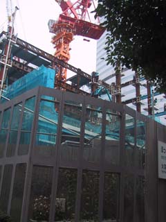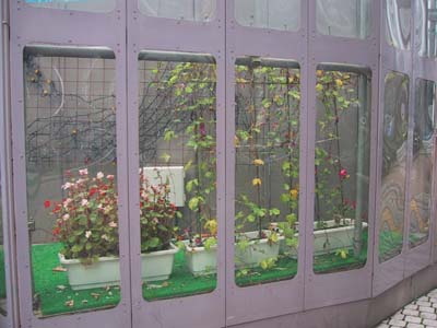 あれ、10月だというのに朝顔が咲いてる。 大宮駅前の歩道に、なぜ温室(もどき)が? 温室の上を見上げると・・・