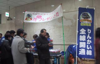 新駅構内では、全線開通記念のポインセチアを配っていて、 電車に乗ると乗客がみんな赤い花を持ってた。 |