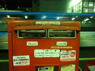 渋谷駅周辺にはなかなか便利な場所にポストがない。でも、旧東急文化会館の 前に、ポストらしい2つの影が。 |