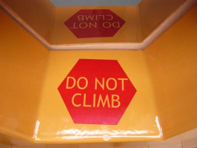 靴を脱げば登ってよいと思われていた巨大カモノハシだが、 「ノボッテハイケマセン!!」と、指導が入っていた。オーストラリア館。 「なんでいけないの?」とぼやきつつも退散する子供たち。 |