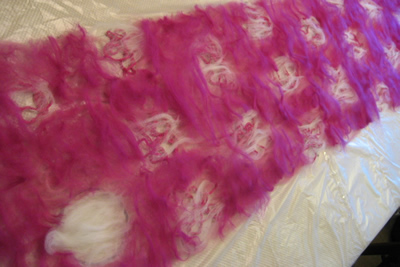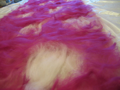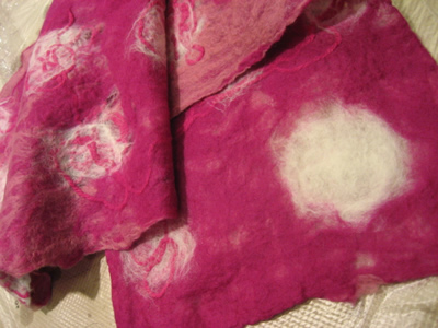 せっけんを溶かしたお湯でなじませて、ふわふわ押して撫でてこすって、 裏返して、撫でてこすって、ごしごしこすって、麺棒で転がして転がして。 これを延々数時間、脱水してアイロンかけたら、和紙みたいなフェルトに なった。 |