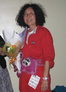 さらに、ときたまロゴをグサグサ埋め込んで、 ときたまの母の腹巻に。ほんとはマフラーのはずだったのだが。 これは、ときたまの母こと土岐小百合さんの監督デビュー作品上映会 を兼ねた誕生会が行われた 乃木坂のクラブでのヒトコマ。 |