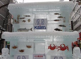 北海道の名産海産物も氷彫刻の中に、終わったら食べるのだろうか?。 カニも昔より値段が高くなって小ぶりになったような気がする。ロシアからの密 漁で成り立っているとの話もあるが、長期的に見ないロシアのカニ密猟者は小さ なかにまでもおかまいなしに取り尽くしているそうだ。そのうちカニも天然記念 物になっちゃうね。 |