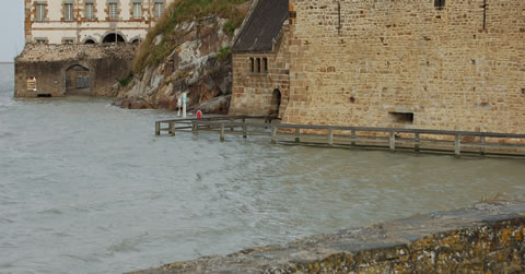左上の黒っぽい壁にぽっかり開いているのが島の入り口、 ラ・ヴァンセ門なのだが、そこへ降りていく階段からして水没している。 午前9時過ぎ。 昔なら、島には渡れなかった時間帯だね。 |