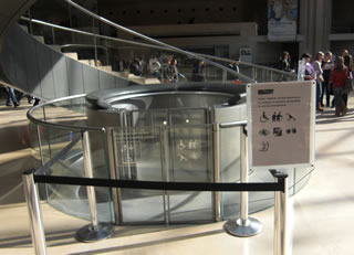 ピラミッド下の広場は、バーゲン会場みたいになっているが、 ピラミッドの1階入り口から降りてくるカッコイイ螺旋階段があるね。 よく見ていると、階段の内側が。。。 |
