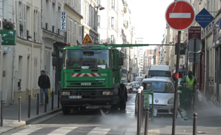 日本の道路洗浄車は夜中や明け方、一般の通行が少ないときに行われているが、 パリでは、フツーの営業時間に堂々と実施している。 もちろんシャンゼリゼ大通りも例外ではない。 え、とこにいるか見えないって? |