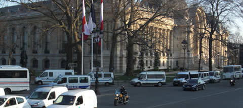 シャンゼリゼは特に、あっちにもこっちにも警察車両の群れが1車線占拠中だ。 日本の警察車両より、デザインが地味なので威圧感はないのだが。 |