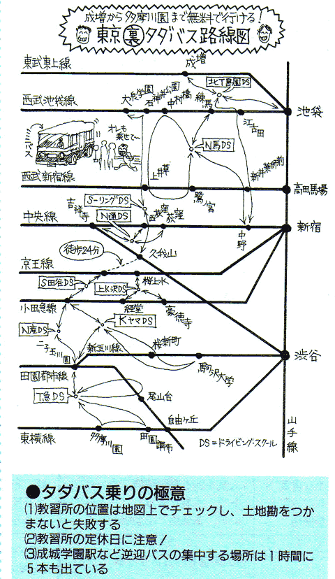そういえば、東長崎機関の活動起源は、これだったかも。 東京都内で誰でも乗れる無料バス路線図。 昔は、こういうふうな自分の頭で考えた節約ケチケチ術がよく雑誌に扱われたので、 東長崎機関員たちは、そのノウハウの達人ということで、けっこう実はリッチに食っ てたね。 これぞ、1995年までの貧困ビジネス。 一方21世紀の貧困ビジネスには、笑いがない。眉間シワ人種の人ばかりがたかって る。 あっ、これが掲載されたのは、月刊誌「ドリブ」(青人社)
