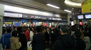 天井には陽が差し込んで明るく穏やかに見えるが、 ここは、2013年3月15日、地上駅最終日の、東急東横線渋谷駅改札だ。 駅員・警備員の「立ち止まらないでくださいっ」「改札では撮影しないでくださいっ」・・ といった絶叫が人ごみに吸収されていく。 |