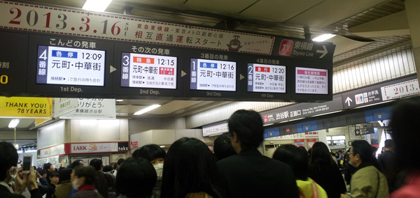 ヒカリエの鉄道案内。 3月16日以降は、いちばん下の東横線だけ 下矢印になるんだね。 (3月18日にはこうなっていた) |