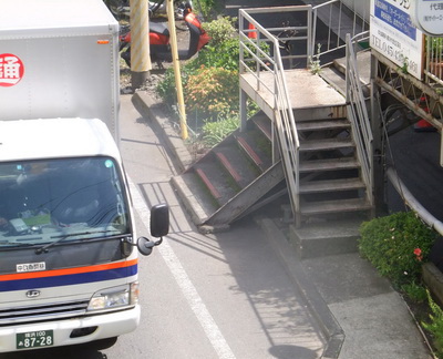 下側の階段だと、階段をトトトトッて降りてきた子供が 車に撥ねられやすいから、90度角度を変えたのかな。