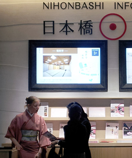 「日本橋」付近で開催されている「桜フェスティバル」。 日本橋川クルージングや観光バス巡回など、いろいろイベントがあるようだが、 日本橋案内所では、桜色和服のブロンド美女が応対していた。 ここは、日本橋三越の向かいに2と3が追加になったコレド室町という複合ビルの地下。 地下道はまだまだ工事中だが、オープンしたビルの周囲は広い空間が出来ている。 |