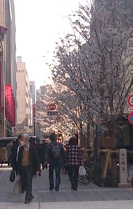 5月や4月並みの暖かさで、開花した桜並木。けっこう咲いてるよね。 通りの右側ビルが、2014年3月20日にオープンしたてのコレド室町3。 |