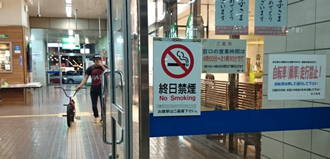 松江駅構内も横断OK。暴走しないで押して行けば、ね。 こんな貼り紙があるということは、混雑時はぶつかったり大変なのか。 |