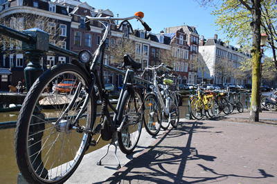 輪っかの模様が並んでいるのではない。びっしり駐輪だ。 平らな国土のオランダは、どこに行くにも自転車を使う人が多いのだから、 どこを向いても自転車がいっぱい。 |