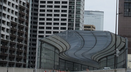 右下のこの曲線美デザインが、直線多きビル街の中で、 なかなか、はまってた。 五輪のために急いで造った道路の屋根。 2021年7月31日。 選手村周辺より。 |