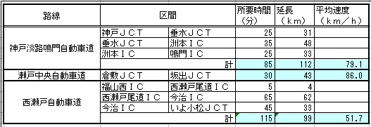 52キロ/時と都市間の一般道路クラスである。西瀬戸自動車道以外の2ルートは全