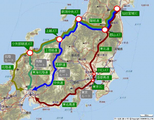 参考データとして、東北自動車道の迂回ルートとして常磐自動車道までのルートも