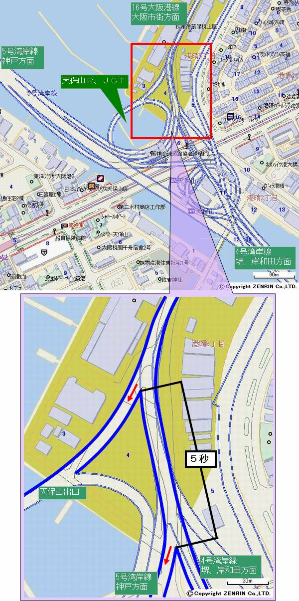 速車 線端と天保山JCTのそれは5秒の差異があることになる。(◆地図1を参