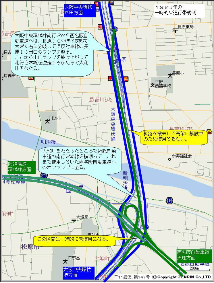 大阪中央環状線南行きとして暫定供用している大和川橋梁は、大和川の北側で 地平 に下りている。本来の配置である外側からS字カーブで暫定区間に至る が、このS字 カーブの向こうに白い高架構造物が見える。大和川橋梁部で南行 きを本来の配置であ る外側に移動させてから、これまで暫定的に使用していた 橋梁部は大和川北側の地平 への斜路は撤去されて、橋梁部の高さをキープして 高架区間に亘る。 なお、高架区間 に入ってすぐに外側への出入口が設置される。これは長原 ICである。これまで、暫 定的だが一般道路と西名阪自動車道が出入りできた 松原ICが高速道路同士のジャン クションに改造されることにより、一般道路 との出入口がなくなってしまう。これま での接続形態を生かすため、ジャンク ションに改造された後は短い区間だが近畿自動 車道本線を経由して大和川を渡 り、長原ICで大阪中央環状線に出入りすることにな る。もちろん、この区間 の近畿自動車道では料金徴収という野暮なことはしない。 1985年、松原ICの南側の美原方面に阪和自動車道の本体が姿を現し始め た。 (◆航空写真6を参照。) また、このころには大阪中央環状線南行きから西名阪自動車道への接続ランプ が、 いびつなかたちになってきた。中央環状線南行き専用のルートは本来の配 置で供用し ているが、西名阪自動車道へのランプだけは近畿自動車道北行きに なる橋梁部を使用 している。これまで使用していた南行きは先述予告したよう に大和川北側で斜路の撤 去、高架化が施工されているので使用できなくなって いるのだ。また、中央環状線の 本来の配置からは構造上西名阪自動車道への接 続ランプを設置するのは難しい。(◆ 模式図2ー1を参照。) |