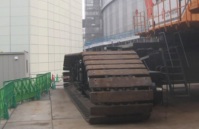 左端の普通のクローラークレーンと、右端の巨大クレーンのキャタピラ。