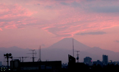 富士の位置は、ビルのアンテナが基準。 あの、アンテナの向こう側が富士ってことでした。 (これは別の日の撮影、2003年10月2日17:30) いつも「あのアンテナ邪魔だなぁ」と思っていたが、役に立つこともあるね。 |