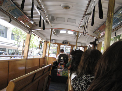 乗客が右側だけに偏ったら、バスが大きく傾いた。 巨体の運転手が必死にバランスを取ろうとしているが、ムダだった。 傾いたまま走行する窓のないバスって、スリル満点じゃないけど、50点くらいだね。 ハワイ・オアフ島、ワイキキにて。