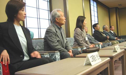 こっち側は、防衛大学校・防衛庁側の方々。 東長崎機関の加藤健二郎に「先生」などという語尾がついているのに、こ んな席で、こんな写真撮って遊んでるってとこ、東長崎機関だね。VIP ルームに座ってもVIPになれない人格ここにあり!! |