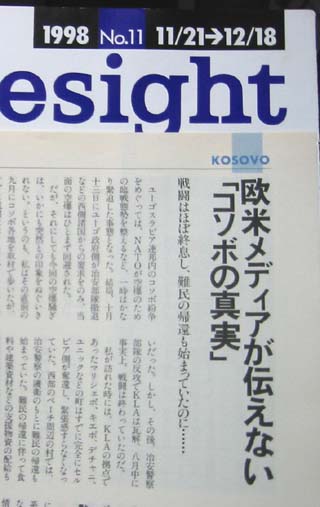 東長崎機関メンバーは、1998年11月 21日発売の月刊「フォーサイト」では、 コソボ紛争の情勢に関係なく、アメリカは、 ユーゴを空爆したいから、するんだ」とい う記事を掲載していて、これがユーゴスラ ビア政府に拍手喝采された。 |