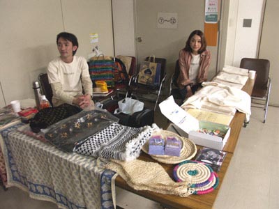 会場では、珍しい緑のカフィーヤなんかも売ってます。 おすすめはオリジナルTシャツと、ロゴ入りカンバッジかな? |