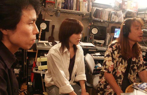 特別ゲストとして、サントリィ坂本洋さん(右)も 1月27日には、出演することになった。 これは、「愛の人質」のレコーディングのとき。 まり子ちゃんもヤッチもマジメに緊張してるね。 |