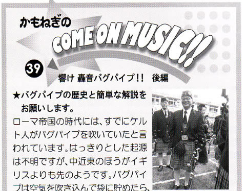 成田シティージャーナル誌上で、 かもねぎのCOME ON MUSICで、「響け、轟音バグパイプ 」の後編。 セントパトリックデイのときの正装。 前編はこちら かもねぎさんのホームページはこちら 成田シティージャーナルのホームページはこちら http://www.naritacity.com/journal/kamonegi/index.asp |
