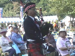 ジブリの森は、10月2日の朝からバグパイプの轟音に包まれたのでした。 だいたい演奏25分、MC5分で、17曲(同じ曲の繰り返しを除いて)やった かな。 |