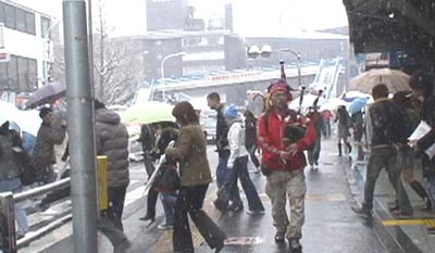 樹林帯と建物や道路に囲まれた空間で、そこに雪がいっぱい舞う中だったのが原 因なのかどうか、バグパイパーは1人なのに、数人でバンド演奏しているような 柔らかい音で聞こえた。 雪の中でやったりすると、やっぱり、いろいろな新発見があるね。 |