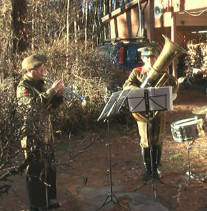 お寺の前で、開会演奏をしたあと、 樹林帯に分け入り、完成したツリーハウスの前で、完成式典コンサート。 |