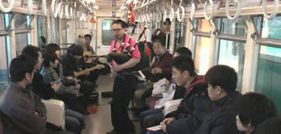 みんなで合唱タイムもありますよ。 空中音楽会でした。 千葉都市モノレールには、貸切企画が人気です。 前回、貸切ライブは、都電荒川線でした。 バグパイプは乗り物貸切ライブ向き。 第2回都電貸切コンサートの光景(2008,11) 第1回都電貸切コンサートの光景(2006,05) 主催: クロブチ(ユーロブラス) |