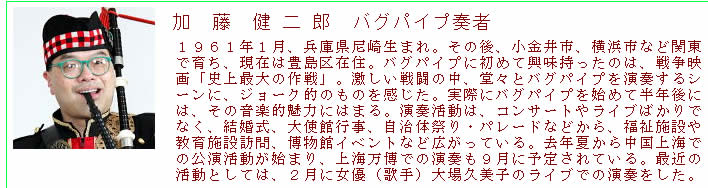 日時: 2010年4月10日、13:30〜15:00 場所 多摩市立永山公民館5階ベルブホール (京王線/小田急線:永山駅近く) 今までは、演奏の合間のMCでバグパイプうんちく考をチョロッと述べる程度だったが、 今回、初めて、講義のほうにたっぷり時間を使える企画が到来です。 今回、バグパイプ講義になった運びは、オリンビックのカーリング競技でバグパイプ演 奏がされたこと、北京オリンピック開会式でも、バグパイプ隊が演奏したことなどがキッ カケとなっている。 バグパイプといえば映画だけでも「史上最大の作戦」「ワーテルロー」「特攻大作戦」 「クイーン」「戦場のアリア」「フォーウェディング」「世界の涯てに」「ブレイブ ハート」「パットン大戦車軍団」などなど、短いが目立つ扱いで登場している。 しかし、映画評論家さんたちは、バグパイプについてはコメントしない。 そんなふうに、なぜか避けられてきたバグパイプうんちく考について、いろいろ語れそ うです。もちろん、そのうんちく考にあわせた曲の演奏もしてゆきます。演奏ジャンル 幅の広いカトケンだからこそ、できるエンターテイメントだね。 |