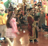 女川運動公園の総合体育館避難所にて。 アイドル星野はるな着ぐるみ隊とバグパイプ。 |